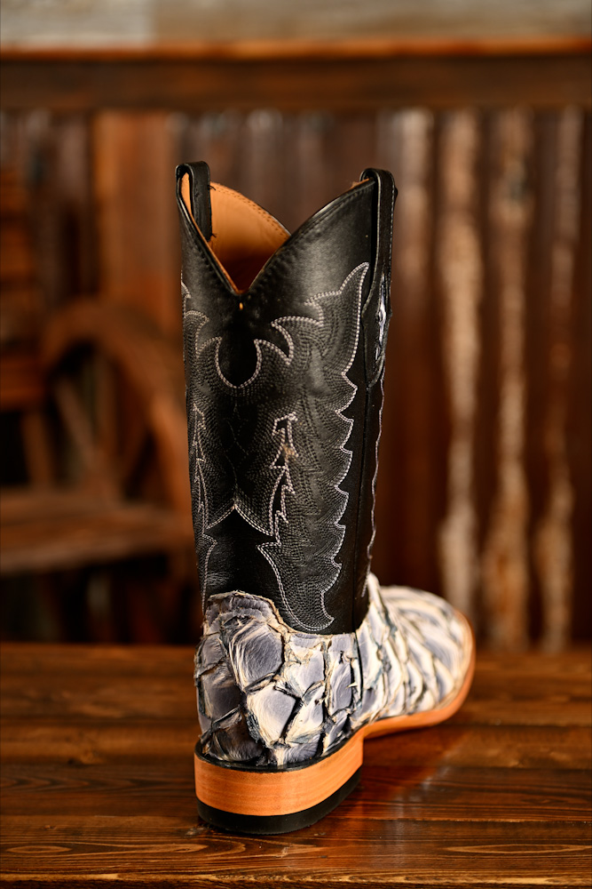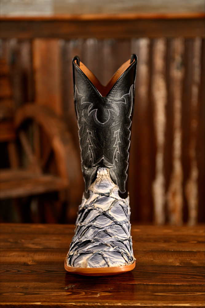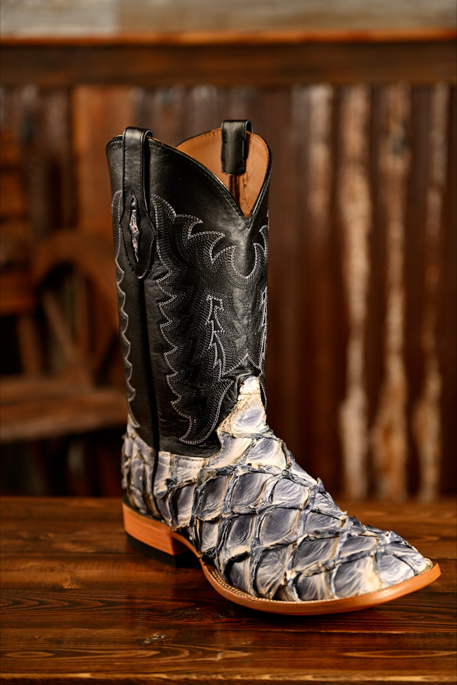 Show up and show out with a brand new pair of Blue Jean Pirarucu Fish Leather Boots. Designed for luxury and modern trends made with exotic materials. Hand crafted, made with real leather and materials specialized for comforth and durability.